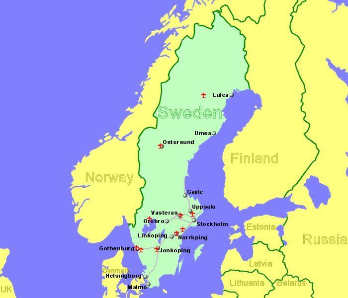 Mapa dos aeroportos na Suécia. Suécia mapa (Norte da Europa - Europa) para imprimir. Suécia mapa (Norte da Europa - Europa) para download. Em 2004, estimava-se que existiam 254 aeroportos. Em 2005, um total de 155 tinha pistas pavimentadas, e havia também dois heliportos, como mostra o mapa dos aeroportos na Suécia. O aeroporto internacional de Arlanda em Estocolmo recebeu o seu primeiro avião a jacto em 1960; outros aeroportos principais são Sturup em Malmö e Landvetter em Gotemburgo. O Scandinavian Airlines System (SAS) é operado conjuntamente pela Suécia, Dinamarca e Noruega, cada um dos quais detém 50% do capital da empresa que opera no seu próprio território; a outra metade na Suécia é detida por investidores privados. A Linjeflyg, uma subsidiária da SAS, opera um serviço doméstico para a maioria das grandes cidades e resorts. Em 2003, cerca de 11,586 milhões de passageiros foram transportados em voos regulares domésticos e internacionais.